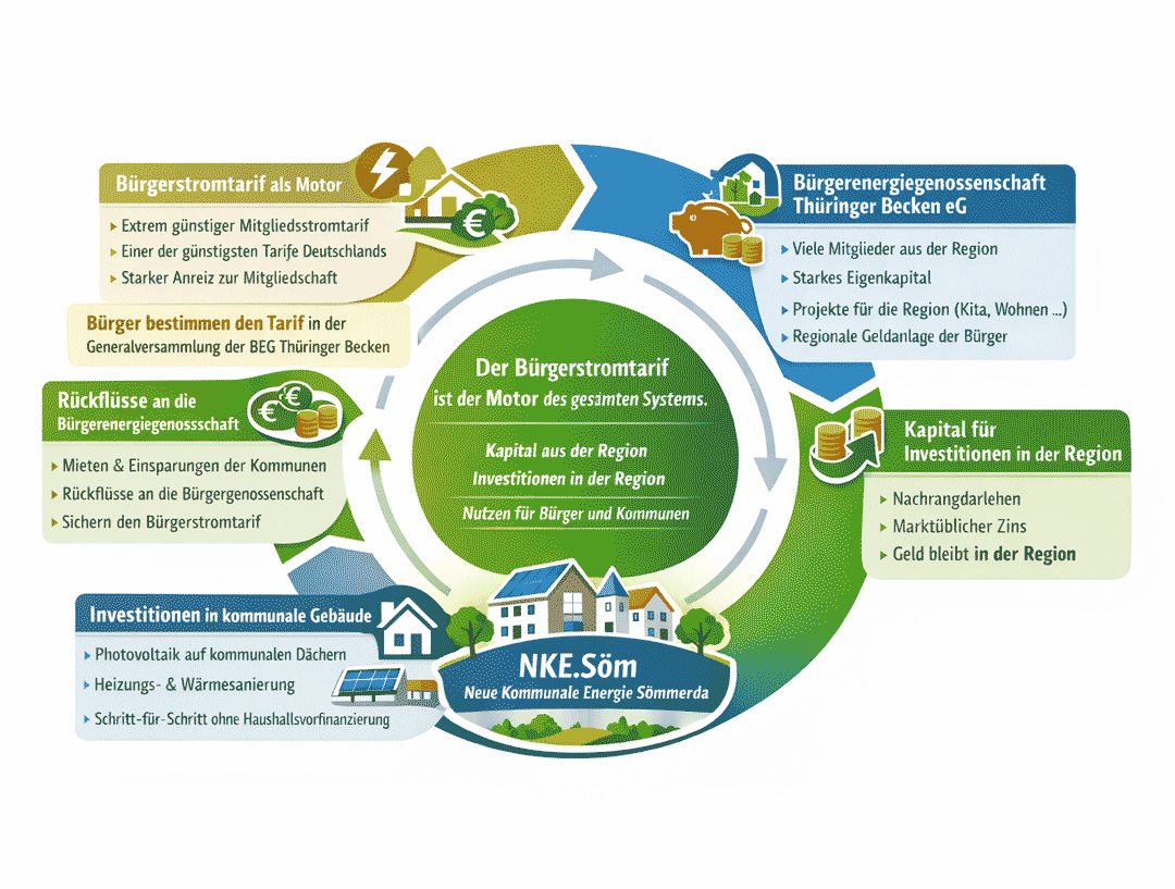 Erneuerbare Energie wird vor Ort erzeugt, gemeinsam organisiert und so genutzt, dass Strom bezahlbar bleibt, kommunale Infrastruktur gestärkt wird und Bürgerinnen und Bürger konkret profitieren.